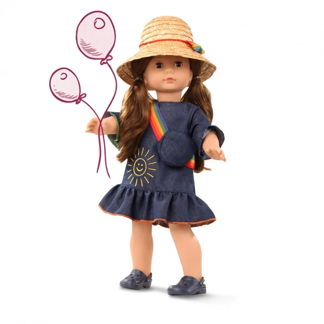 De zon schijnt en Elisabeth in haar nieuwe outfit doet hetzelfde. Wat een geweldige dag om wat vrienden buiten te ontmoeten, te gaan winkelen en te genieten van een ijsje. Elisabeth draagt haar spijkerjurk met kleurige volants en geborduurde zon. Maar echt gaaf is haar hippe crosstas met riem in regenboogkleuren. Om de stijl compleet te maken zet Elisabeth haar strohoed op.