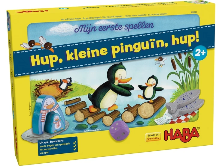 De pinguïnmama’s wonen met hun baby’s op een eiland. Maar lekkere vis vind je alleen op het vasteland, en de pinguïnbaby’s kunnen nog niet zwemmen. Gelukkig steken genoeg stenen, boomstammen en planken uit het water zodat de pinguïnbaby’s samen met hun mama’s naar de overkant kunnen huppen. Wie loopt het snelst met zijn pinguïnpaar naar het vasteland en mag daar heerlijk smullen van twee lekkere vissen?