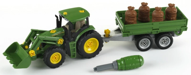 John Deere constructietrekker met voorlader en aanhangwagen. Met de bijgeleverde schroevendraaier zijn zowel de tractor als de aanhangwagen teΒ Β (de)monteren. Compleet met 4 βgevulde zakkenβ welke als lading fungeren.