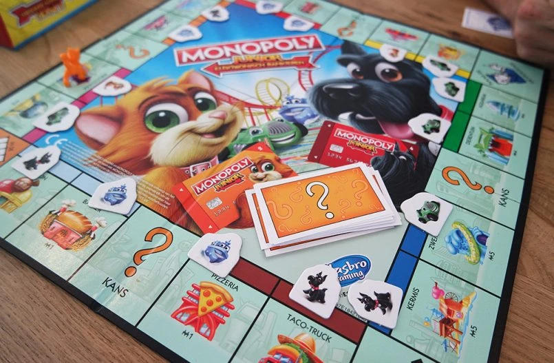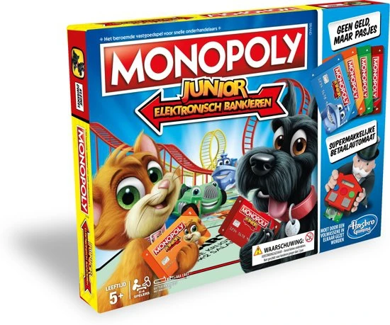 Het klassieke Monopoly Junior spel heeft een nieuw jasje: Elektronisch Bankieren! Het biedt kinderen een eigentijdse bankervaring omdat het geld is vervangen door een elektronische bankautomaat en door Monopoly bankpasjes. Gebruik de pasjes om vakjes te kopen, huur te betalen en om geld te ontvangen als je over Start gaat. En dat allemaal met de 4 favoriete pionnen: Kleine Mollie, Kleine Dwarrel, Speelgoedauto en Speelgoedboot. Bekende en geliefde vakjes zoals de ijssalon, de speelgoedwinkel en de kermis zijn ook in deze versie te kopen door kids. Ze vinden het geweldig om de bankpasjes te gebruiken en hun βverkochtβ bordjes op hun eigen vakjes te zetten. Wie van de kids heeft er aan het eind van het spel het meeste geld? Die speler heeft gewonnen!