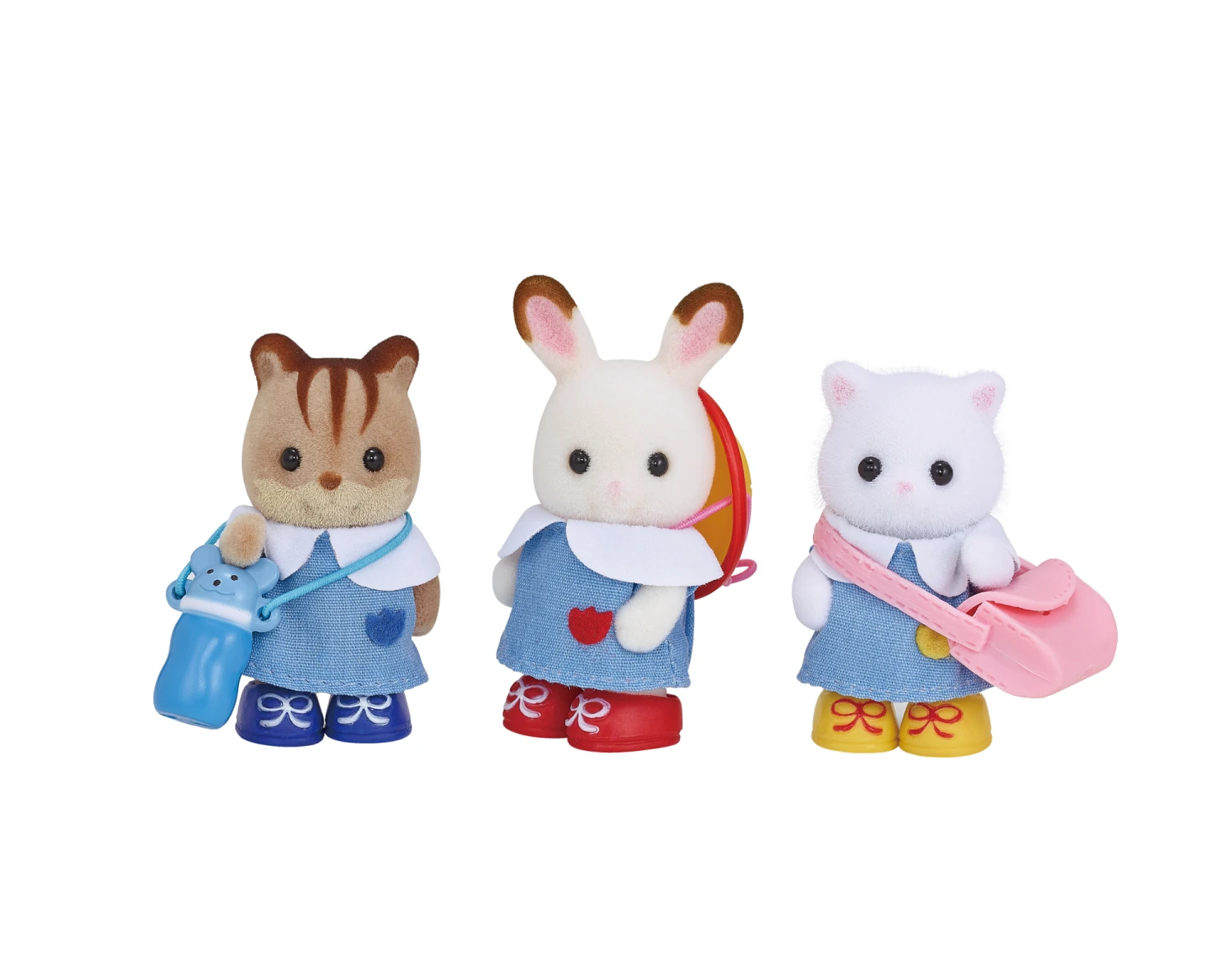 De set Crèchevrienden bevat drie babyfiguren: Baby Chocoladekonijn, Baby Walnoot Eekhoorn en Baby Perzische Kat. Ze dragen crèchekleding met emblemen met verschillende kleuren. Elke baby draagt schoenen in dezelfde kleur als het embleem op hun kleding. De set bevat ook enkele kleine voorwerpen die de baby’s kunnen aantrekken of dragen: een hoed, een drinkflesje en een crècheschooltas. Combineer deze set met andere crèchesets zoals de Boscrèche en de Crèche Dubbeldekker (apart verkrijgbaar).