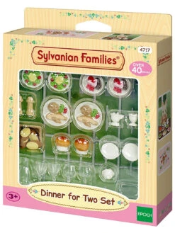 Deze Diner-voor-Twee-set is het perfecte cadeau voor een vader en moeder die samen wat tijd door willen brengen. Er zit zelfs een drie-gangendiner voor twee bij, het water loopt je al in de mond. Met 16 stuks bestek, 2 bekers, 2 schaaltjes, 4 glazen, een waterkaraf en een botervloot zorgt deze set ervoor dat iedere maaltijd in stijl genuttigd kan worden. Een ruime selectie kleine etenswaren zit ook inbegrepen, net als 6 volle borden met eten waar ze van kunnen snoepen. Er zijn zelfs 2 muffins en 4 sneetjes brood in een echt broodmandje. Op het menu staat van alles, van salades tot brood. Deze set verzorgt dus een uitgebalanceerd diner voor je speelkameraden. Als je Sylvanians zin hebben in iets zoets zal het water ze al in de mond lopen als ze denken aan het toetje of de muffins!
