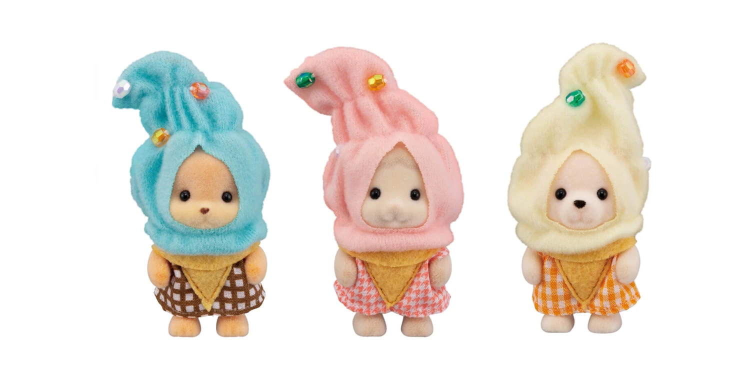Een set van 3 baby figuren met ijsjes outfits. Inclusief outfits met mutsje waardoor iedere baby op een ijshoorntje lijkt. ALLEEN TIJDELIJK VERKRIJGBAAR. Combineer met sets uit de pretpark serie ( apart verkrijgbaar) voor meer speelplezier! Karamel hond baby, schaap baby en ijsbeer baby, alle drie in ijsjes outfits. Totaal 3 stuks .