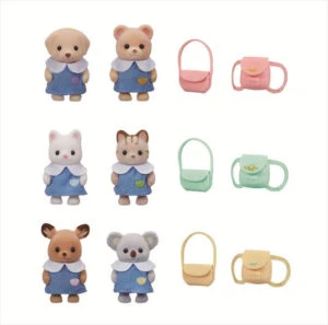 Deze set bevat een baby boskat, een baby koala, een baby zijde kat, een baby beer, een baby labrador, een baby hert en 3 schoudertassen en rugzakken.