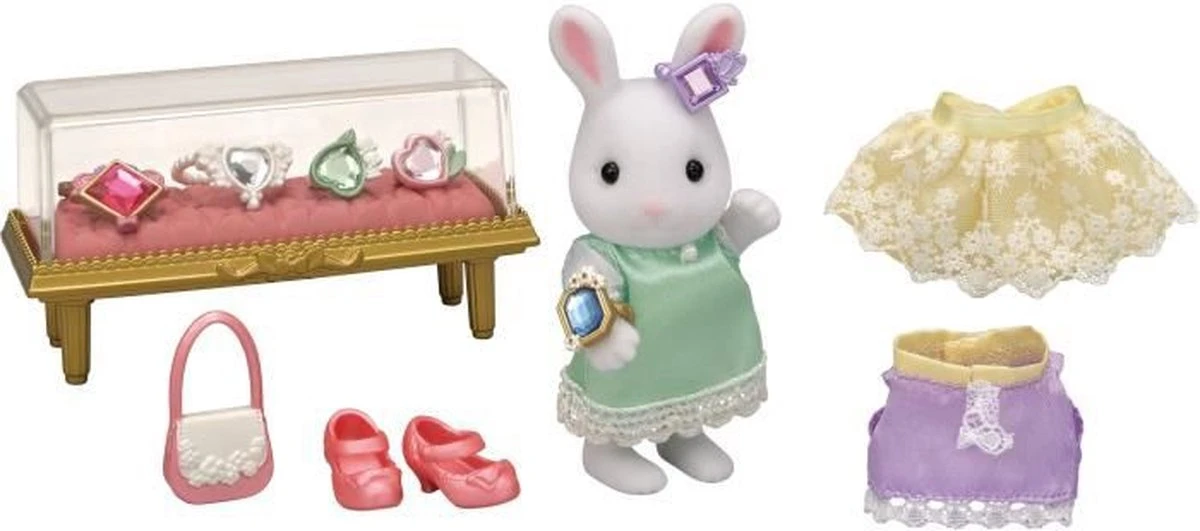 De Fashion speelset- juwelen en edelstenen bevat de oudere zus konijn sneeuwwit Ruby en accessoires met glinsterende edelsteentjes.